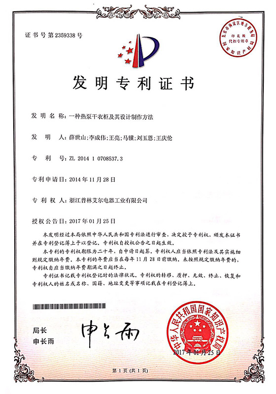 2017年一種熱泵干衣柜及其設計制作方法發明專利證書