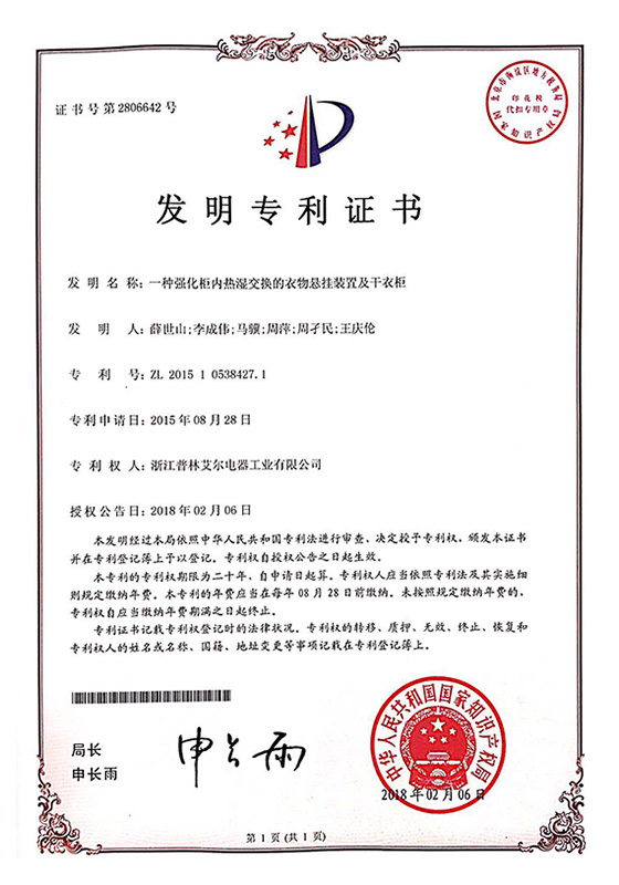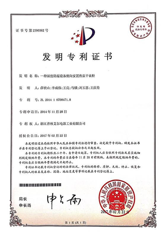 2017年一種深度除濕設備側向安置熱泵干衣柜發明專利證書