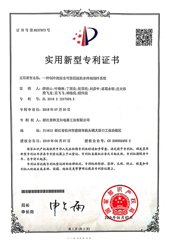 2019年一種制冷劑安全可靠回流的多終端制冷系統實用新型專利證書