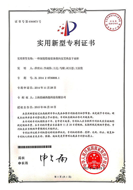 2015年一種深度除濕設備側向安置熱泵干衣柜實用新型專利證書