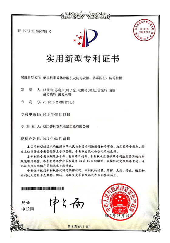 2017年單風機半導體除濕機及防霉衣柜、防霉櫥柜、防霉鞋柜實用新型專利證書