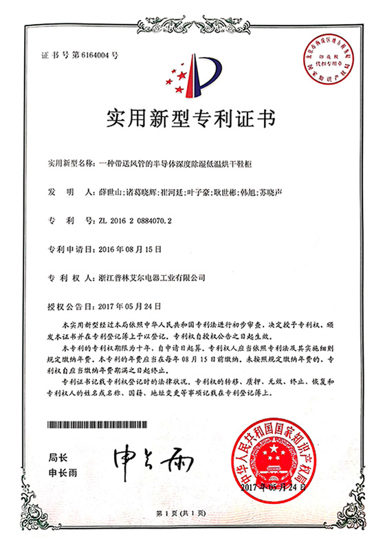 2017年一種帶送風管的半導體深度除濕低溫烘干鞋柜實用新型專利證書
