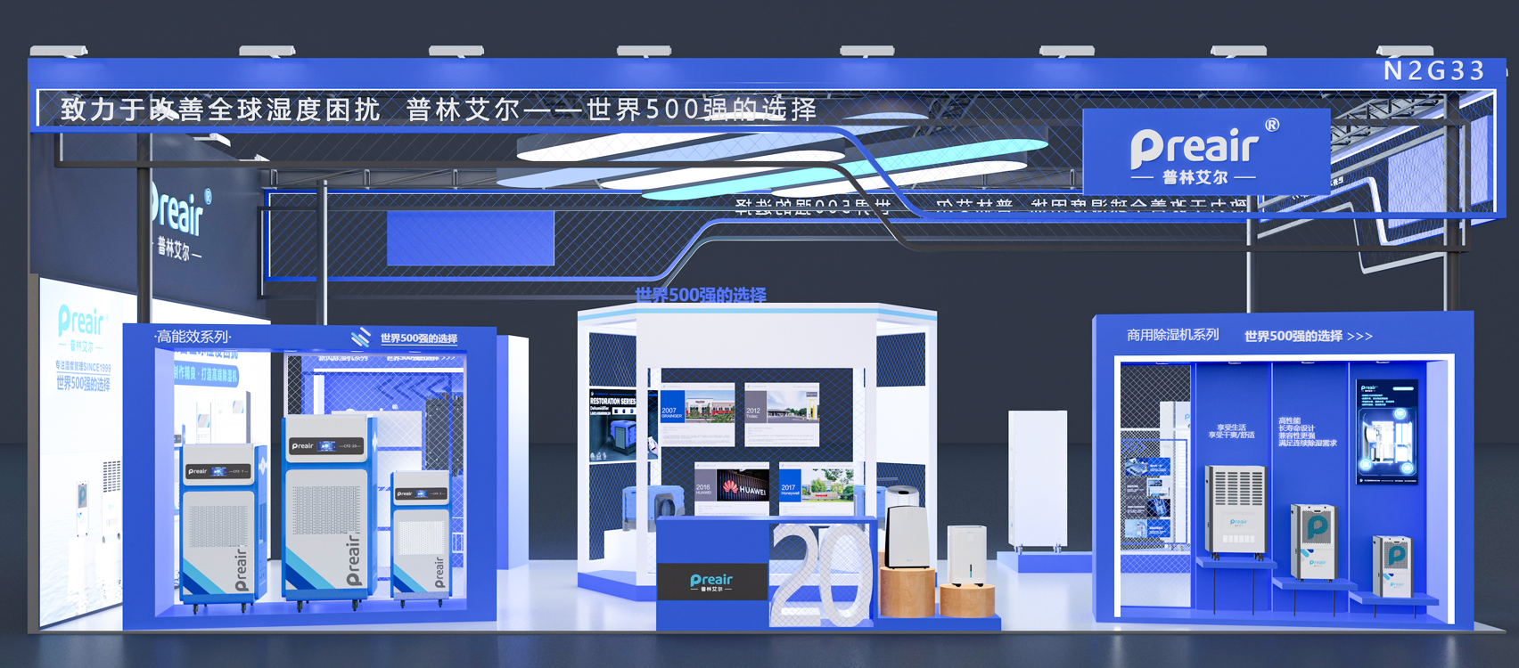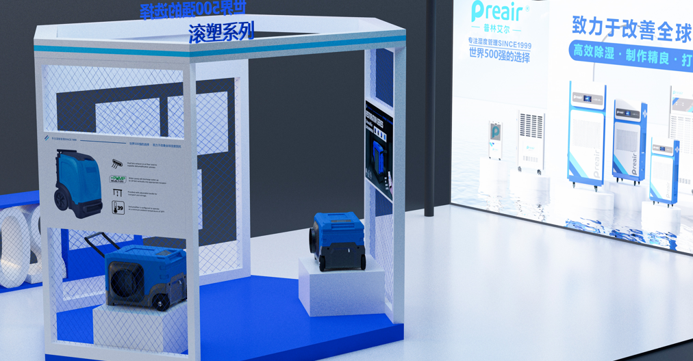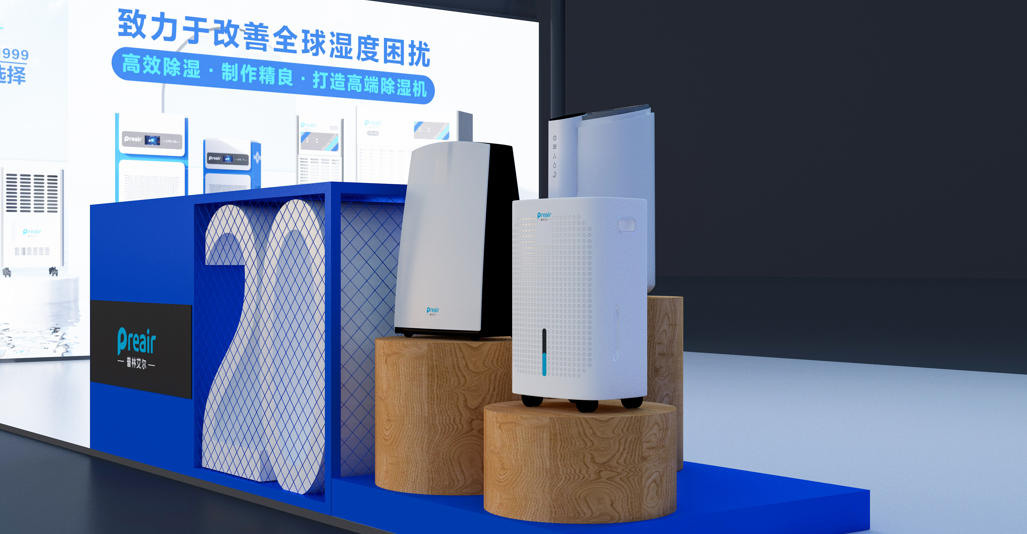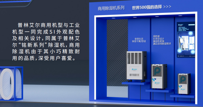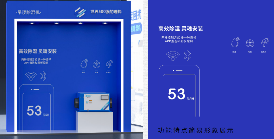 對于占比最大的兩塊燈箱海報,將本次參展的全系列機型( 不包含外貿機型)靜態集中展示,配合品牌的主打廣告語和使命愿景,讓來展臺的觀眾,一下就能關注到我司的使命:普林艾爾——致力于改善全球濕度困擾。