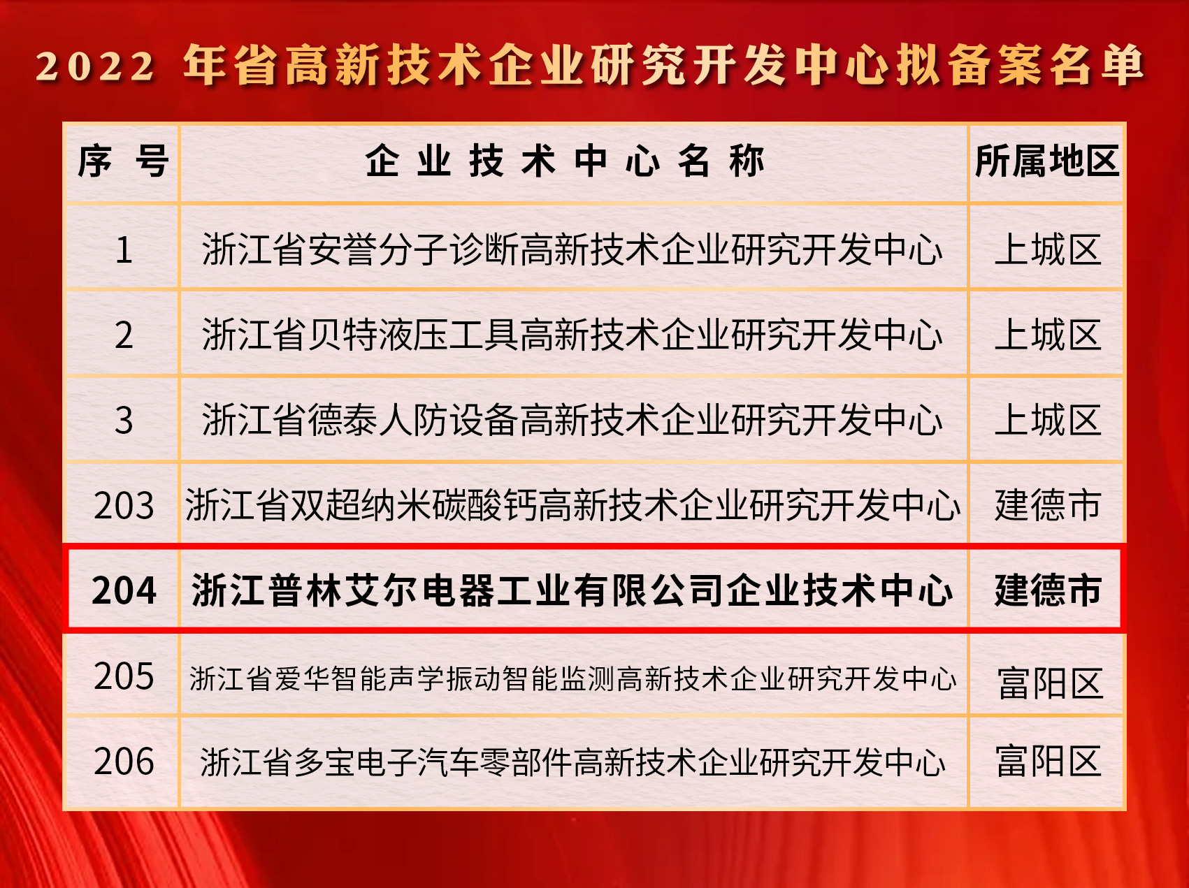 浙江普林艾爾電器工業(yè)有有限公司成功入選,被認(rèn)定為2022年省高新技術(shù)企業(yè)研究開(kāi)發(fā)中心。