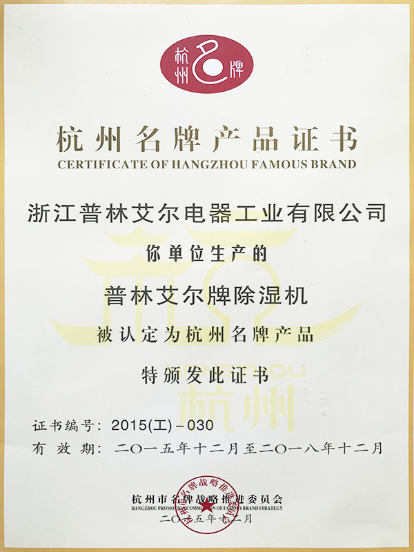 2015年普林艾爾牌除濕機(jī)杭州名牌產(chǎn)品證書